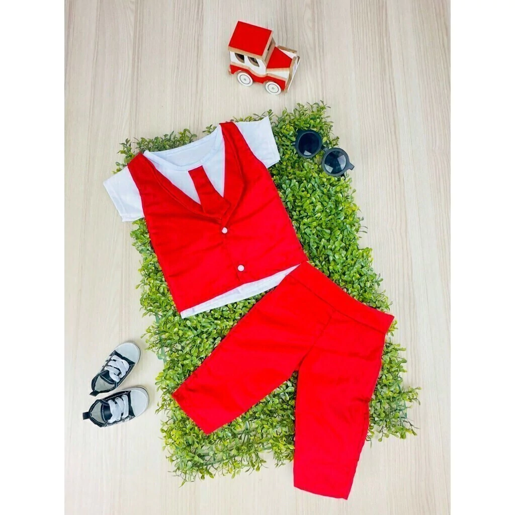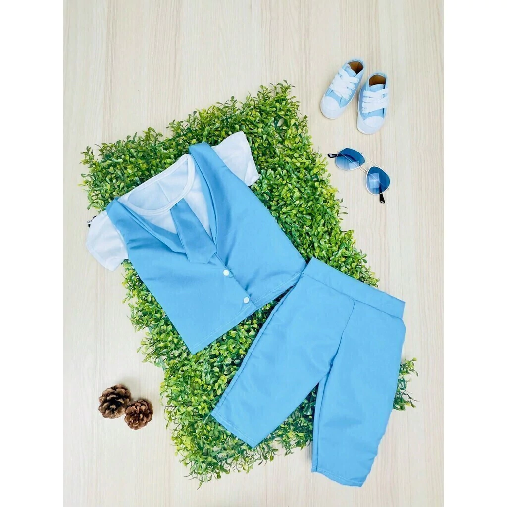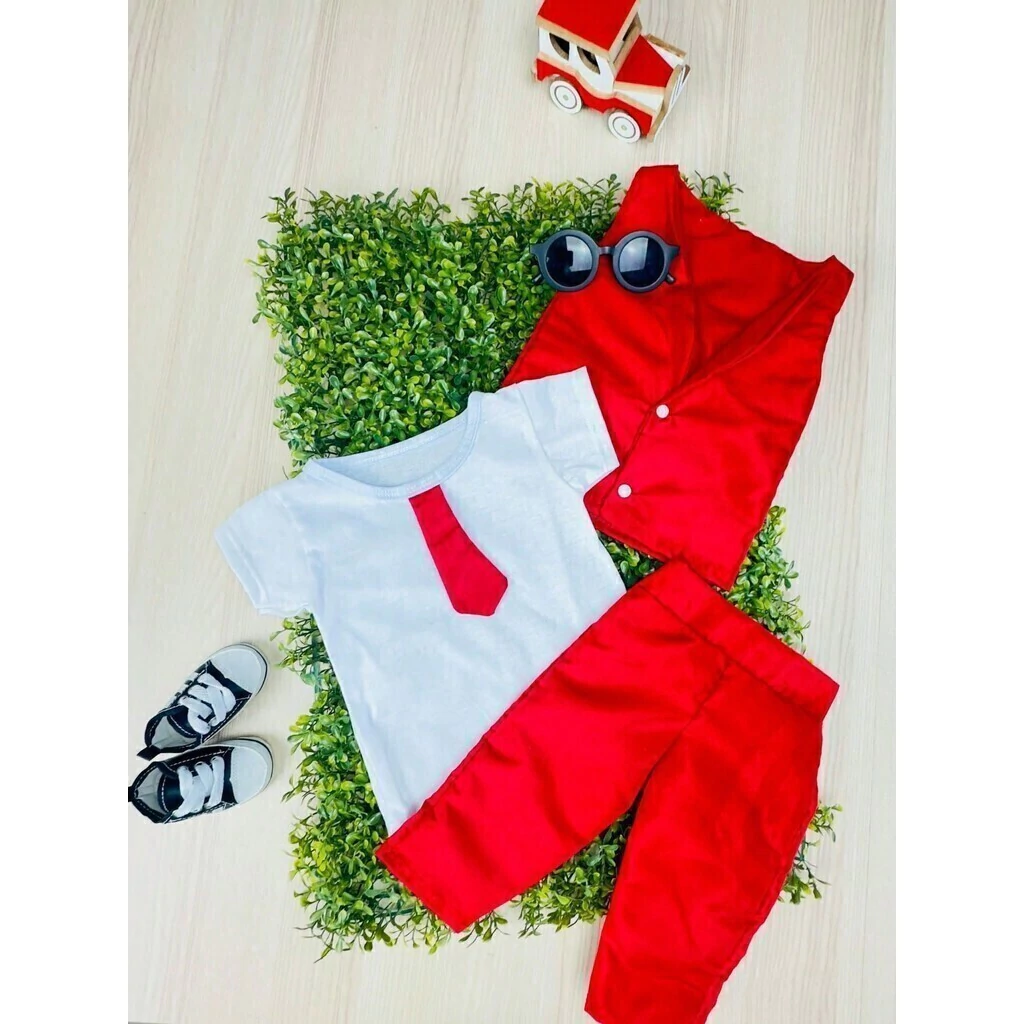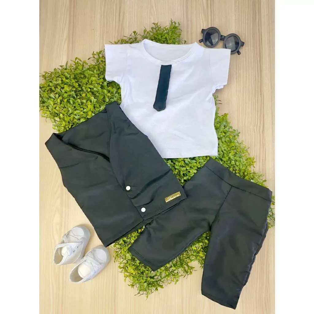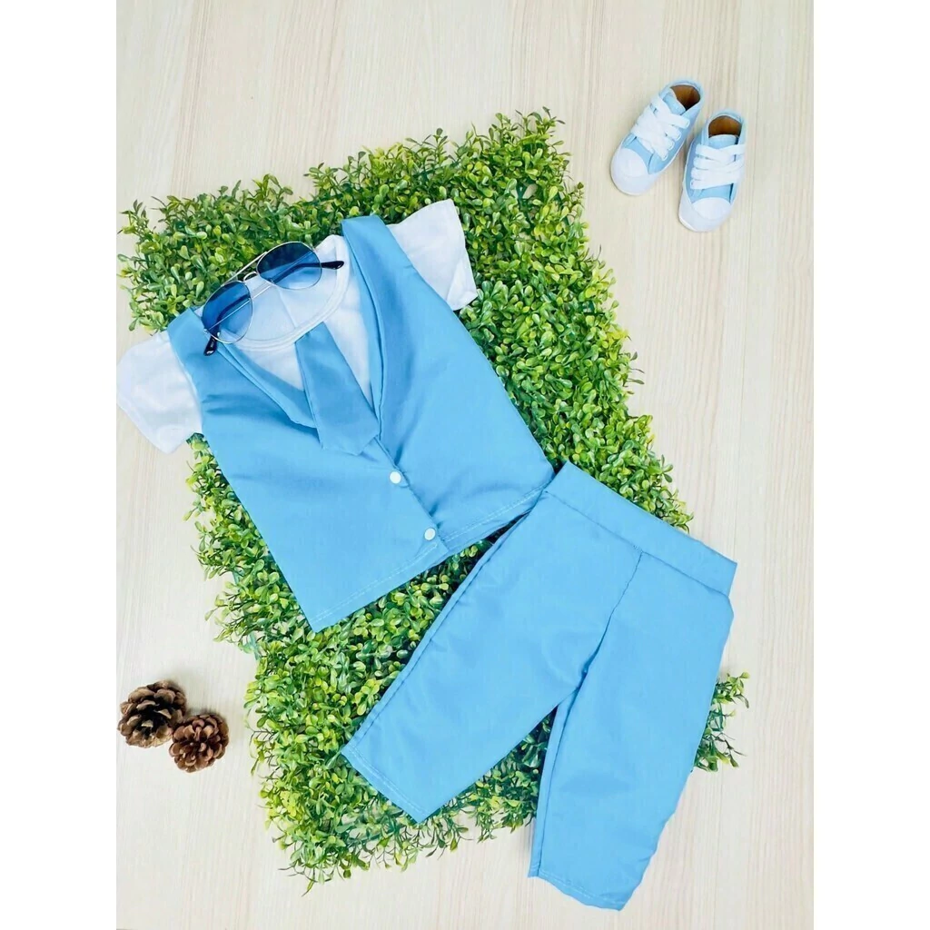 Confeccionado em algodão e poliéster o conjunto Richard contém 3 peças, camisa + colete + calça.