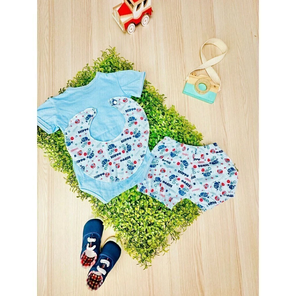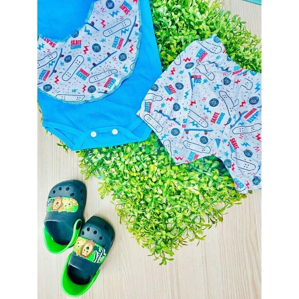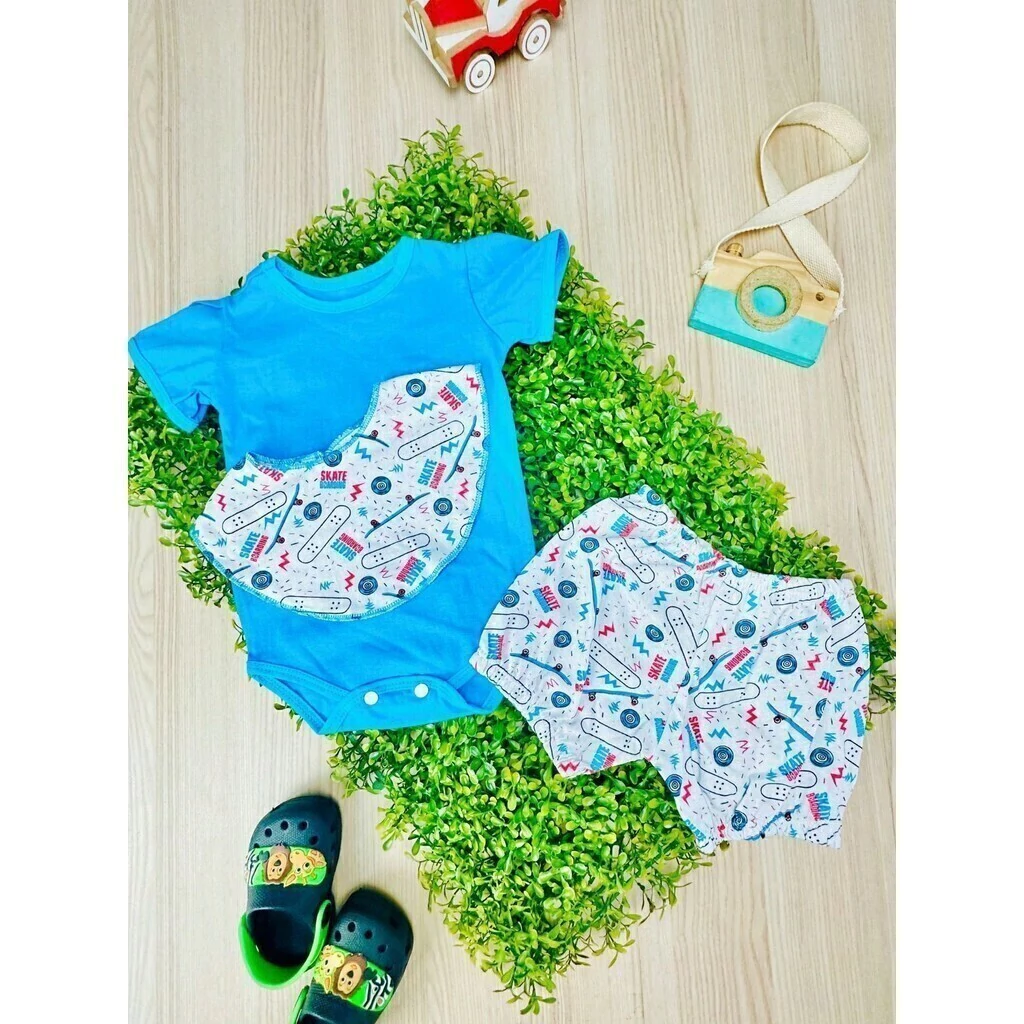 Um conjunto completo de 3 peças, body + shorts + babador de bebê.