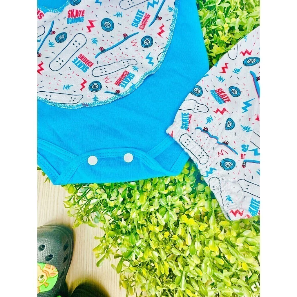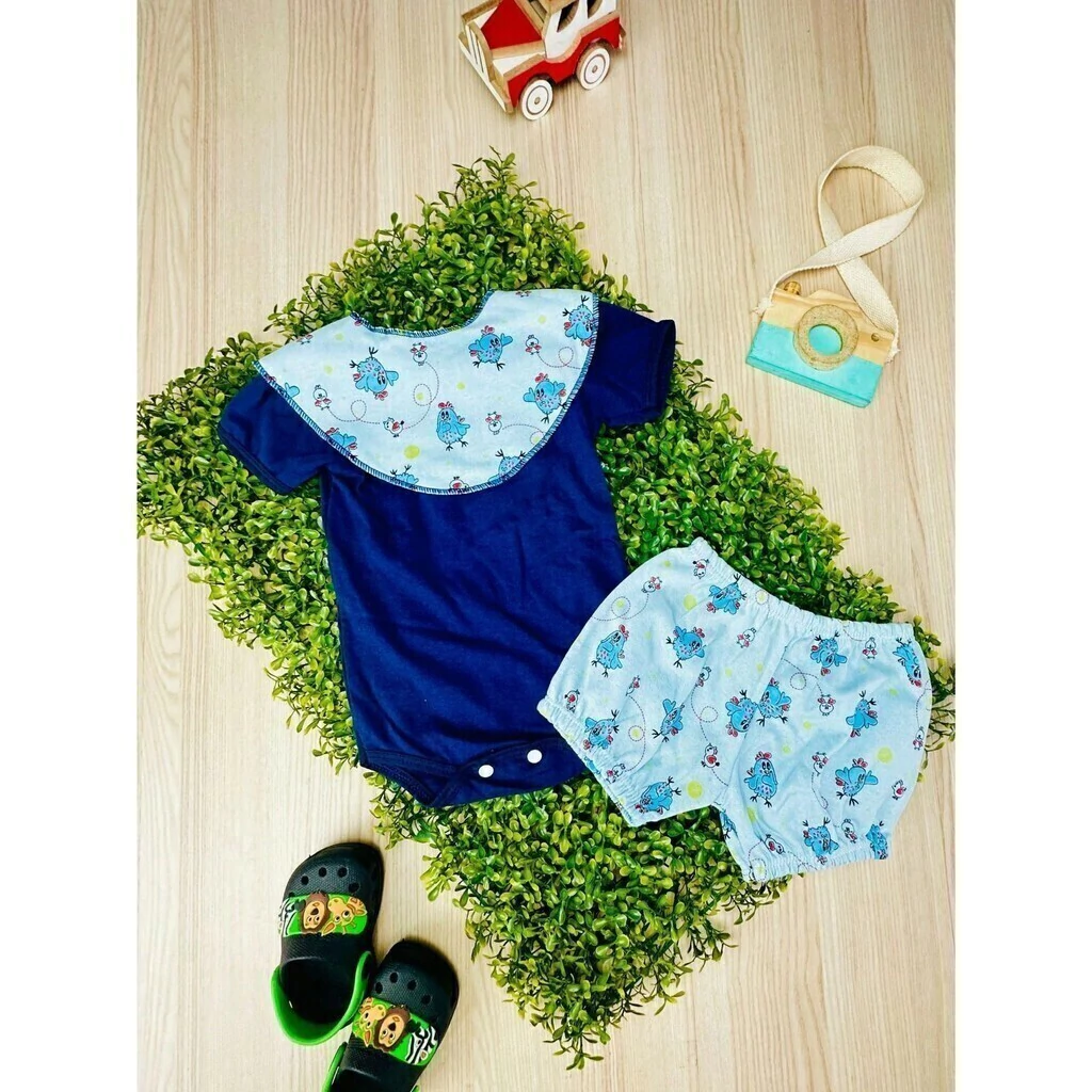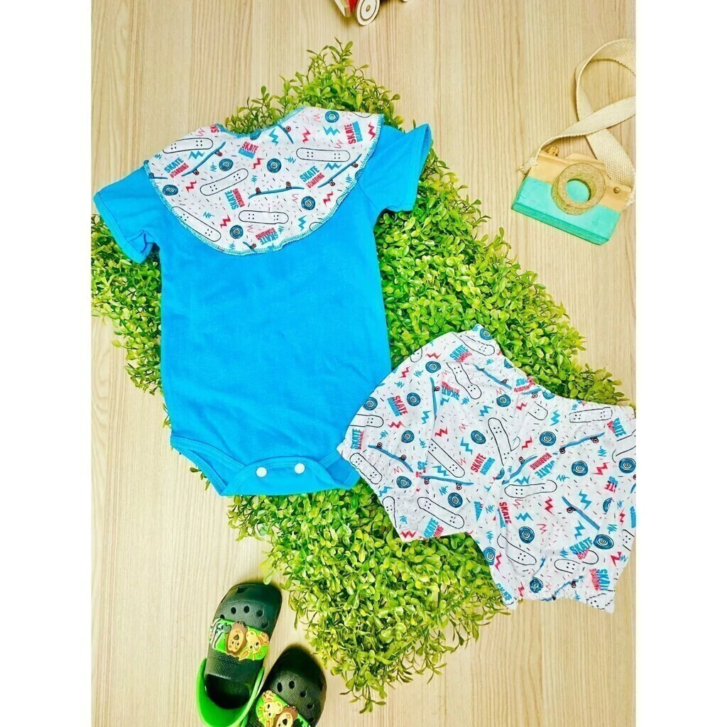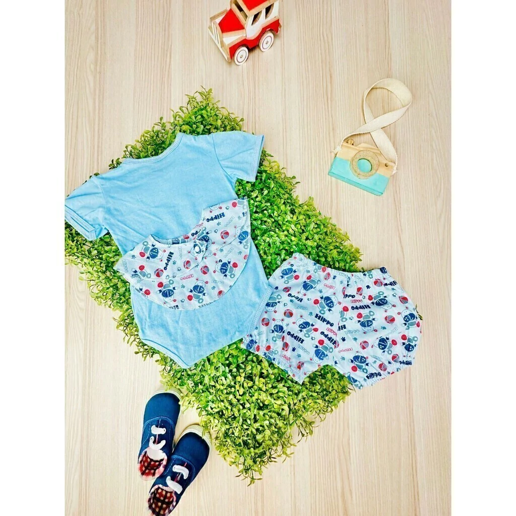Um conjunto completo de 3 peças, body + shorts + babador de bebê.