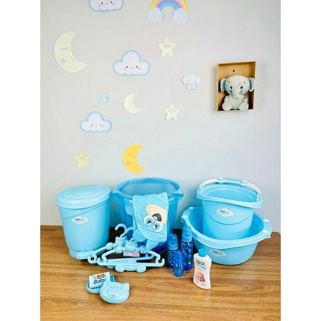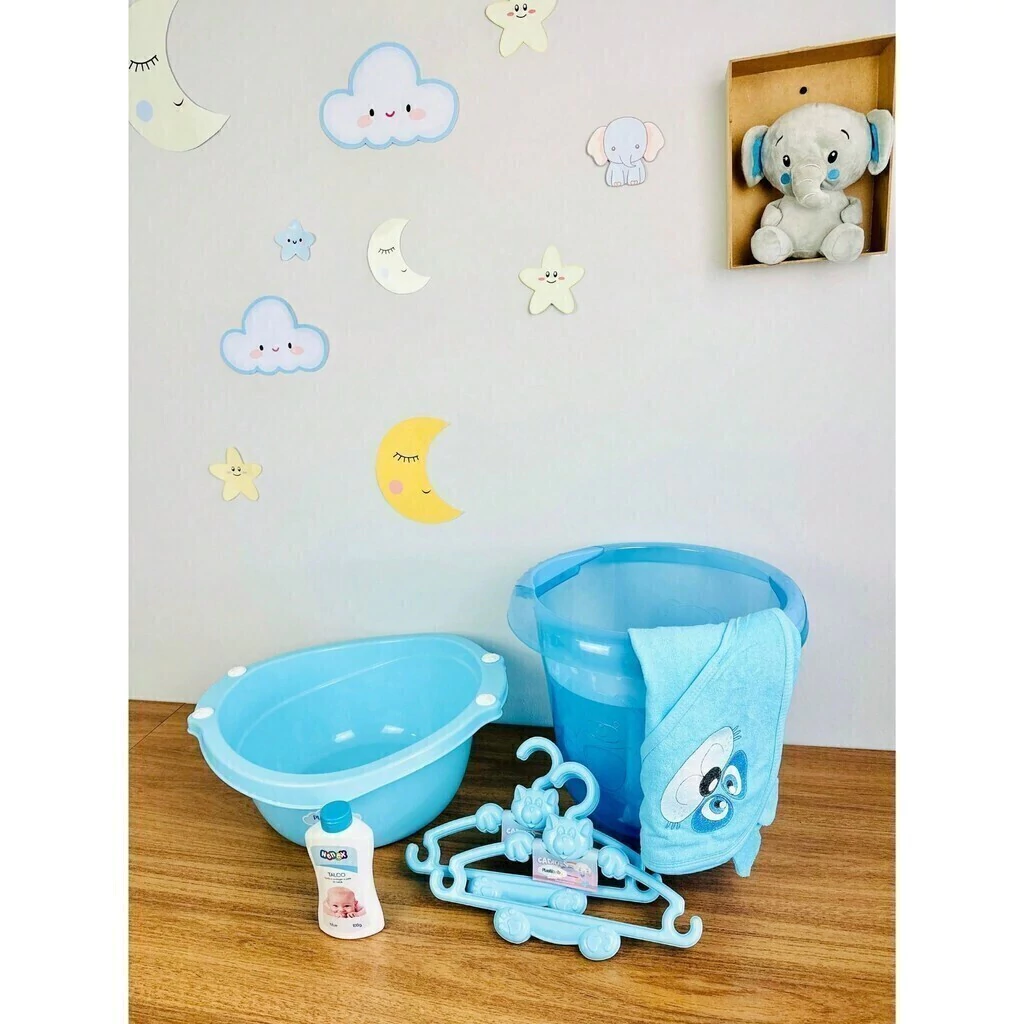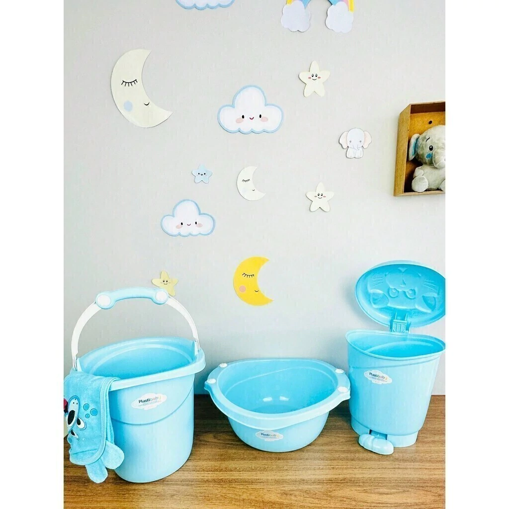 O balde além de auxiliar com as roupinhas do bebê também é útil para levar a água quente até a banheira do bebê, assim não ocupa espaço no banheiro e você pode dar banho do bebê tranquilamente no quartinho dele.