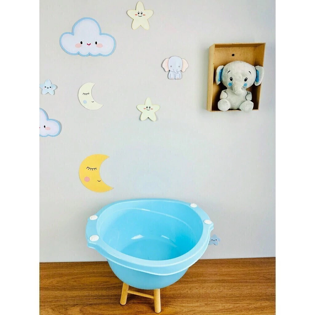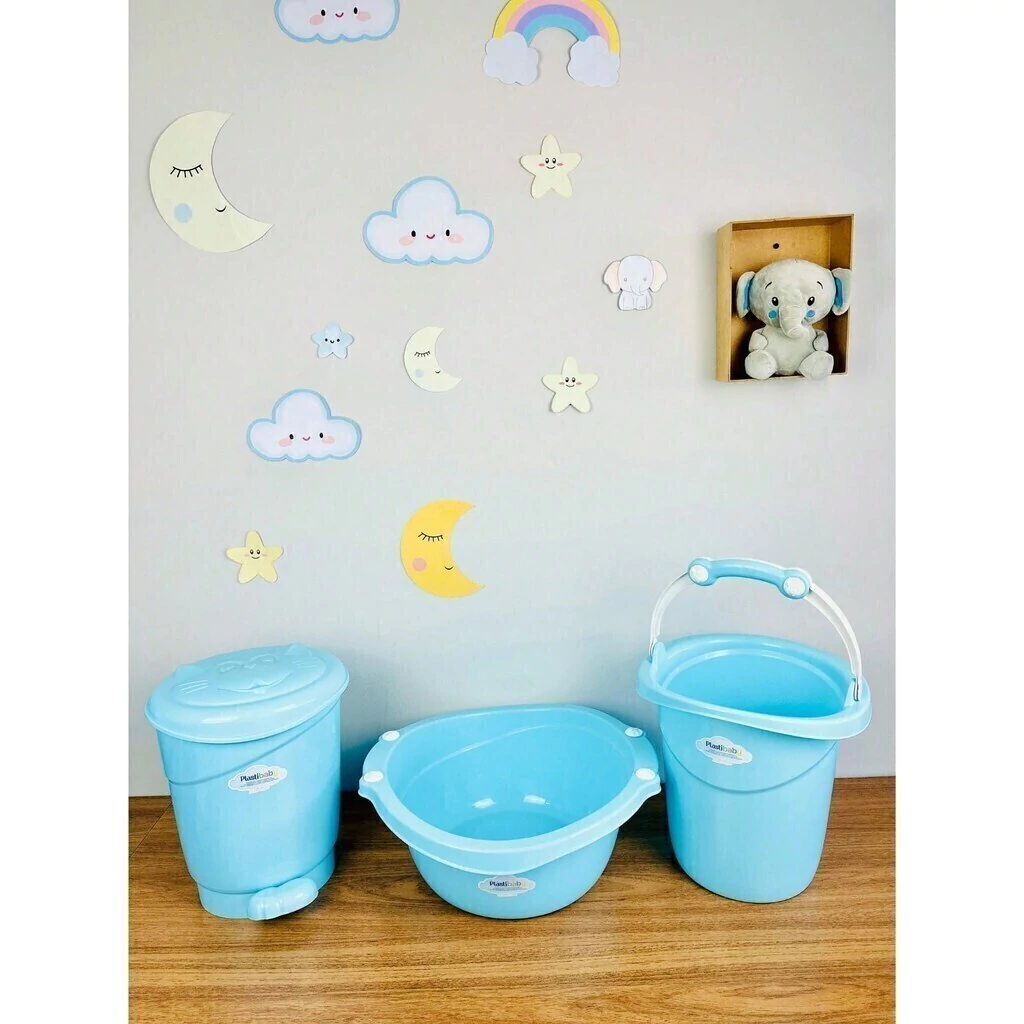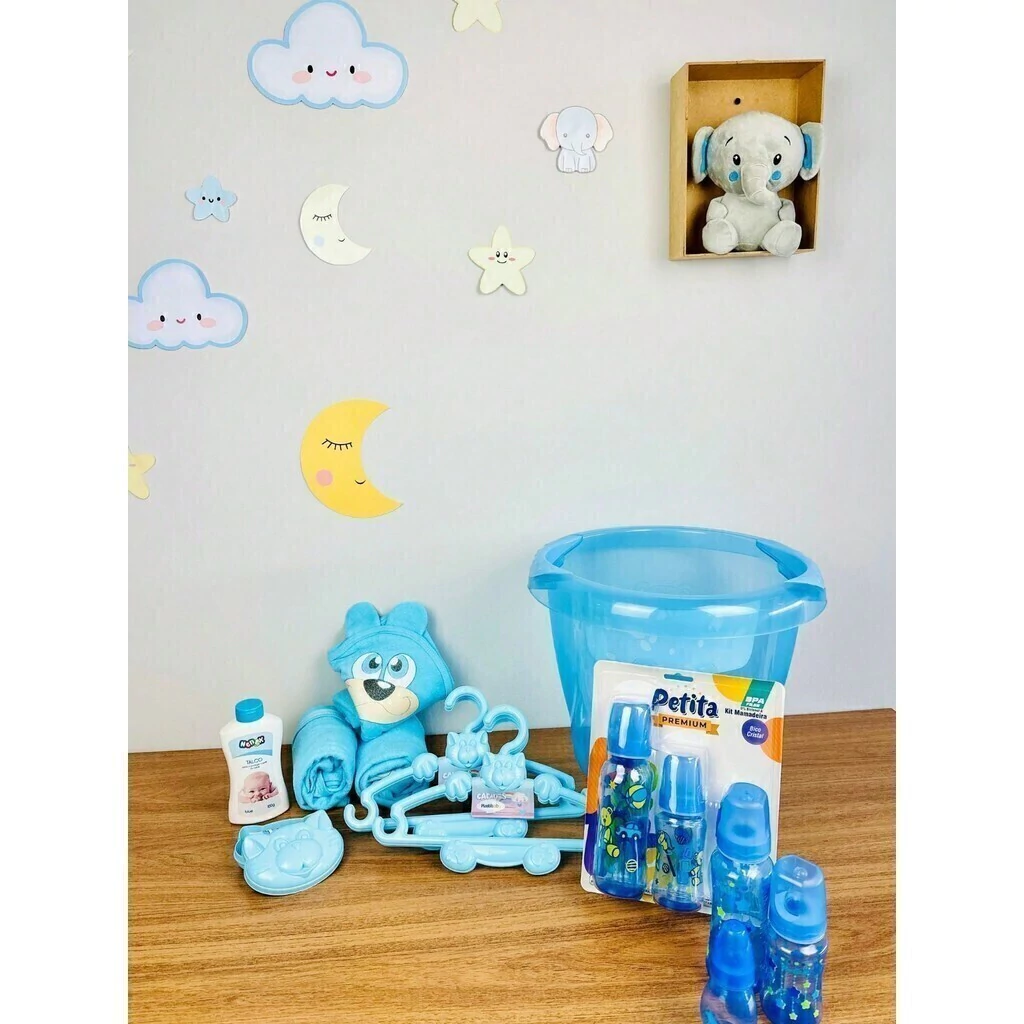 O balde além de auxiliar com as roupinhas do bebê também é útil para levar a água quente até a banheira do bebê, assim não ocupa espaço no banheiro e você pode dar banho do bebê tranquilamente no quartinho dele.