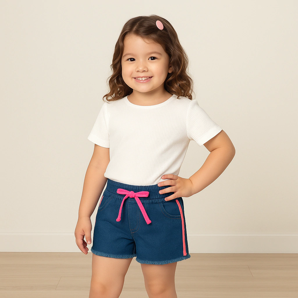Este lindo shorts jeans é perfeito para meninas de até 6 anos, trazendo: