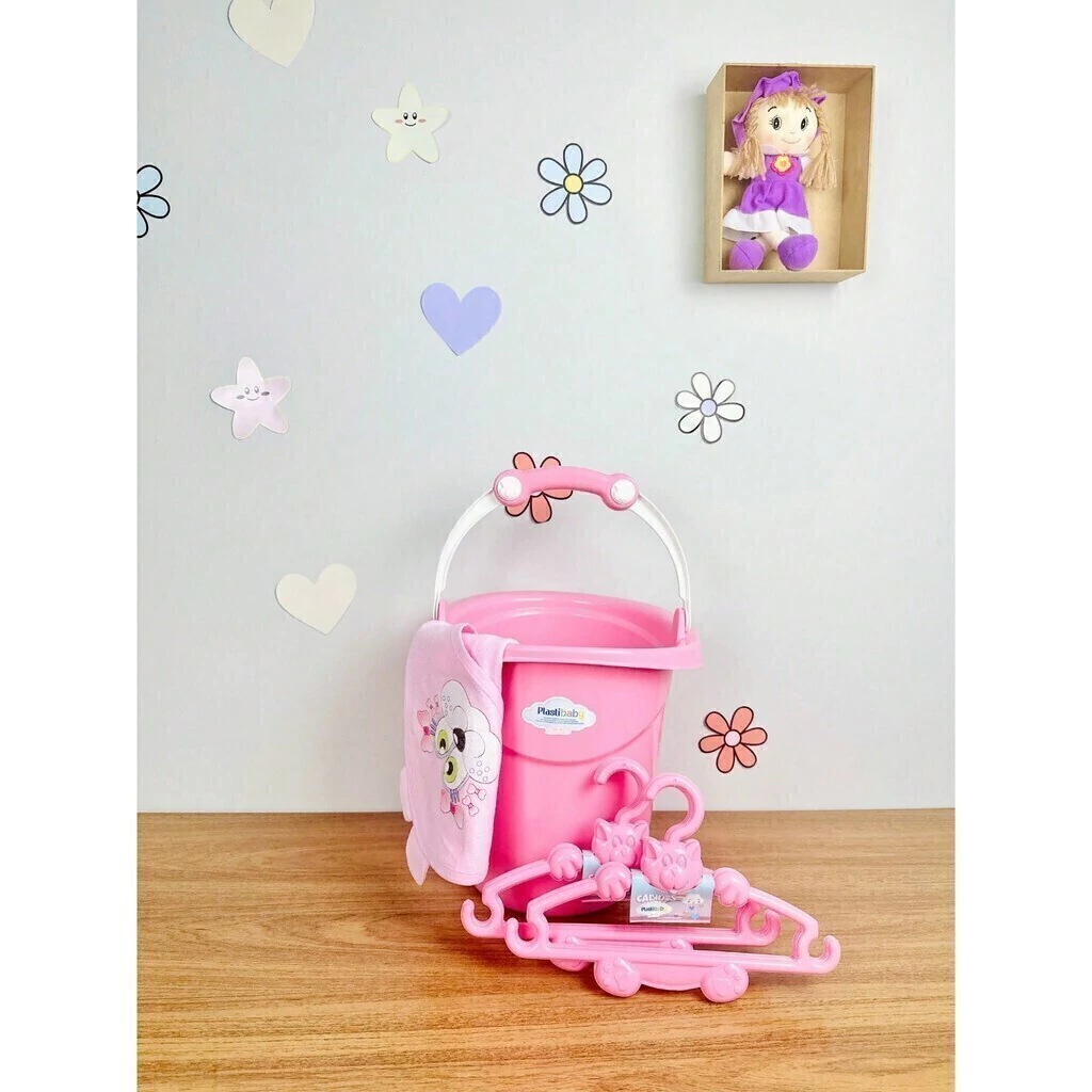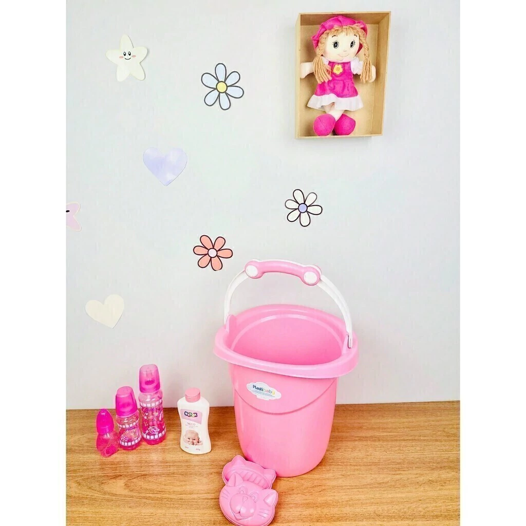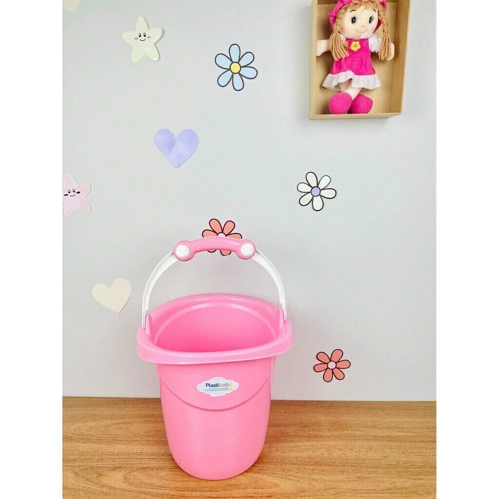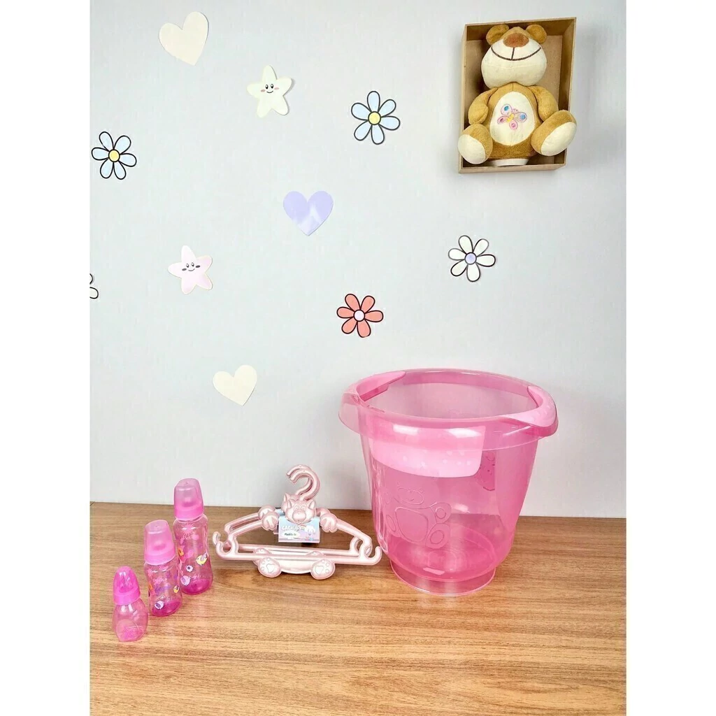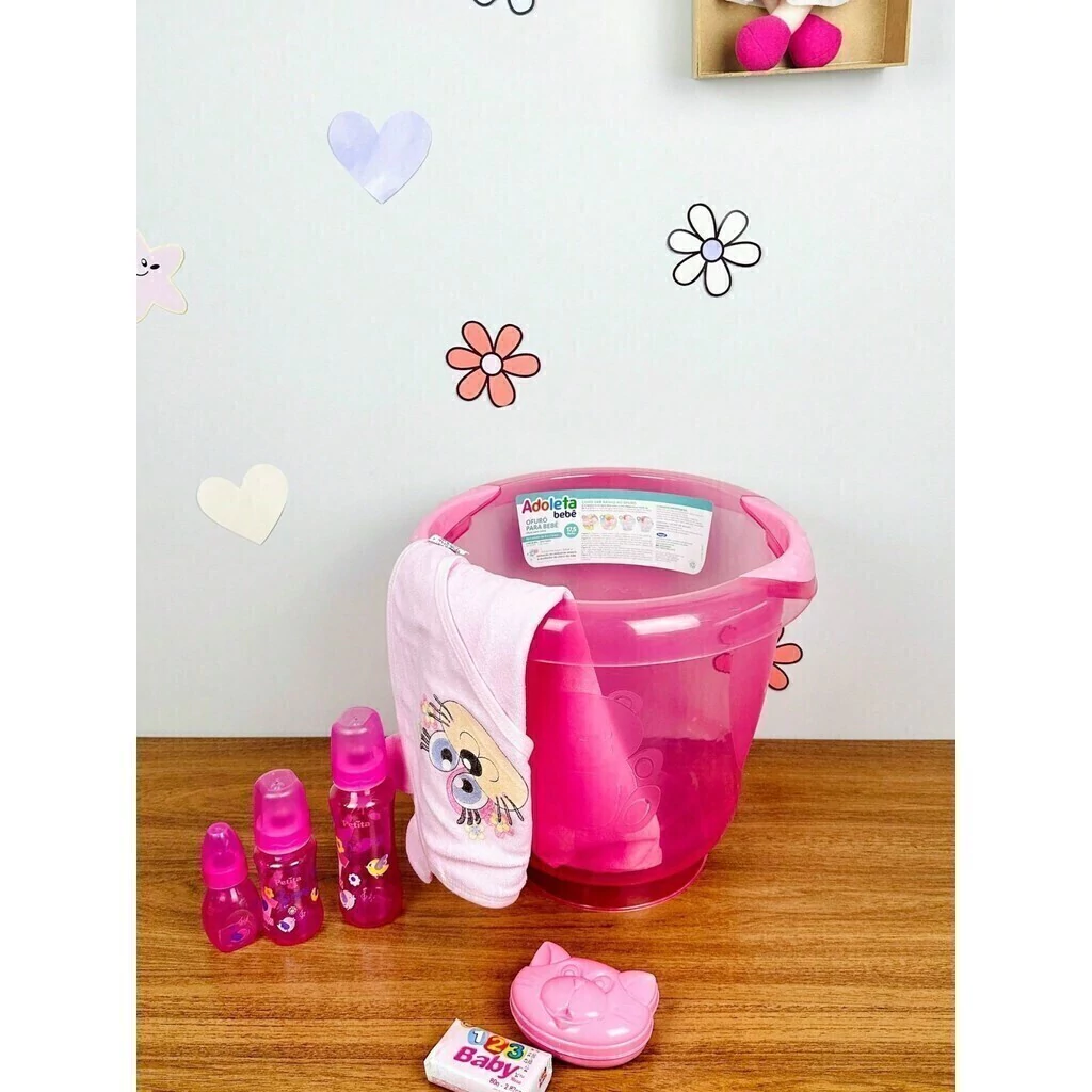 O balde além de auxiliar com as roupinhas do bebê também é útil para levar a água quente até a banheira do bebê, assim não ocupa espaço no banheiro e você pode dar banho do bebê tranquilamente no quartinho dele.