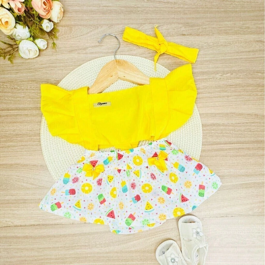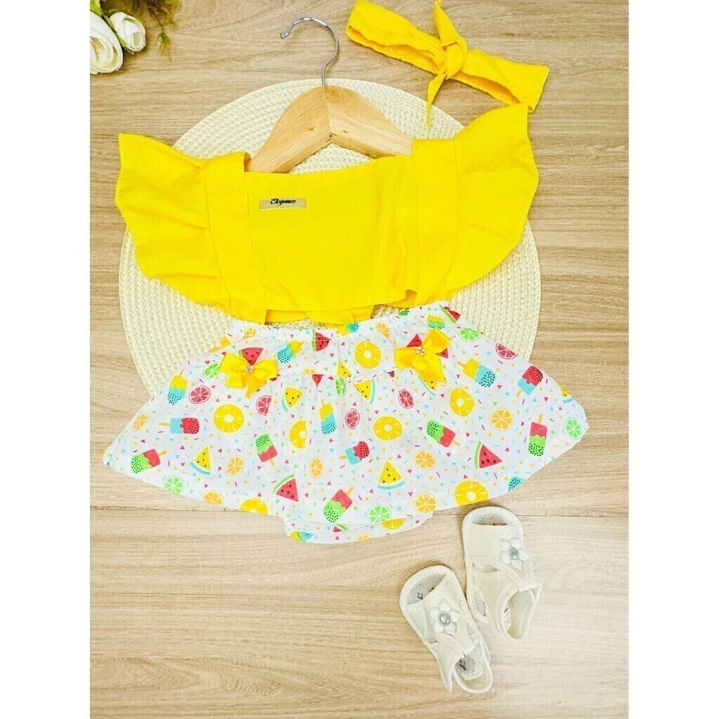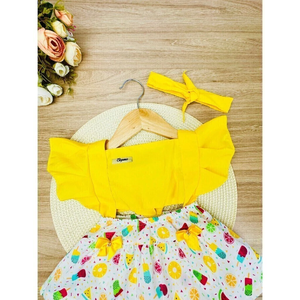 São 2 peças que você irá receber, o romper + a faixa de cabelo. Este é do tema Amarelo c/ Estampa.